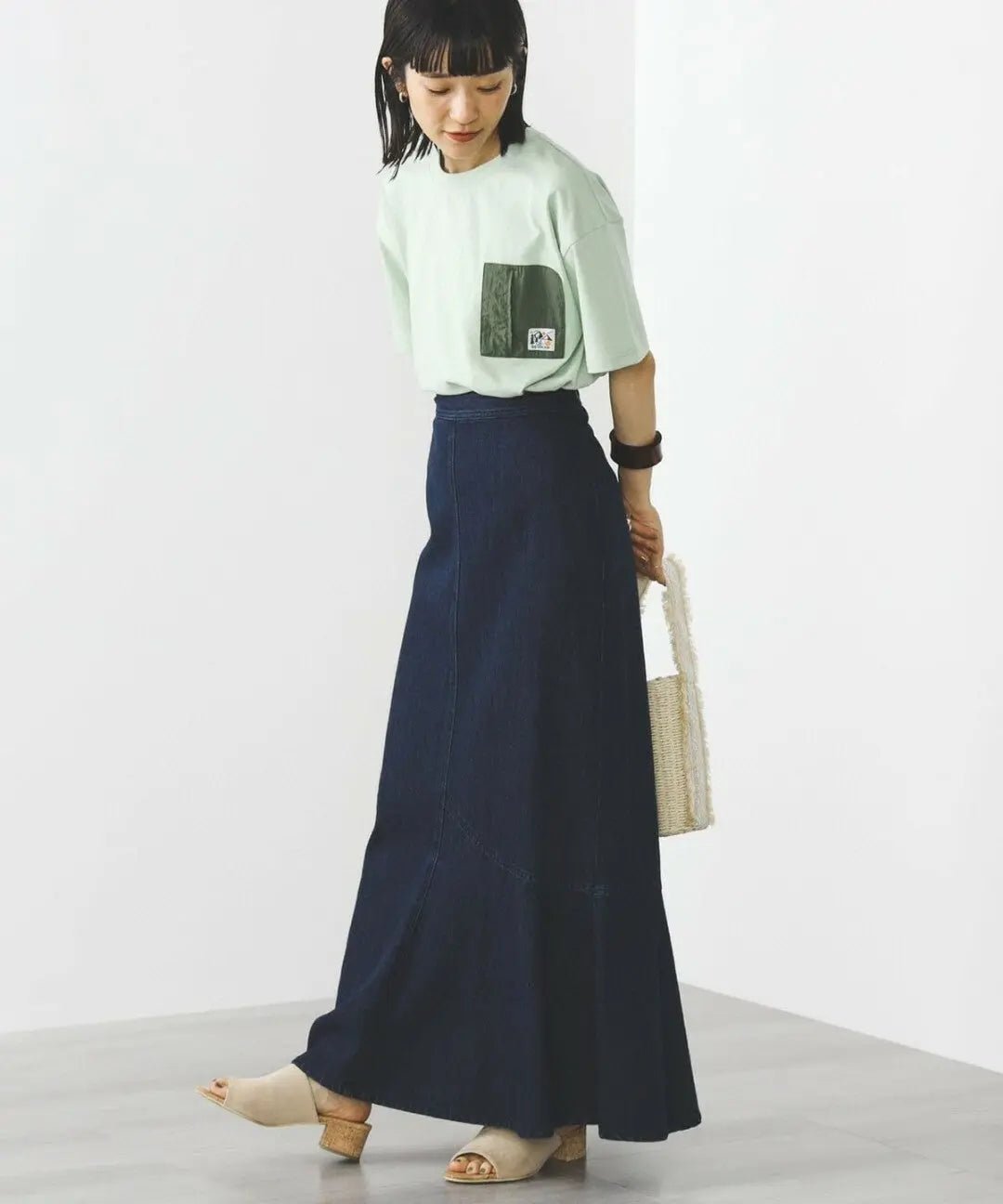 ■ Design A short-sleeved crew neck T-shirt with a different fabric on the chest pocket. An original woven label is added to the pocket to add a touch of interest. This piece is active in a variety of scenes, including daily life and outdoor activities.