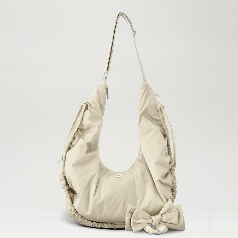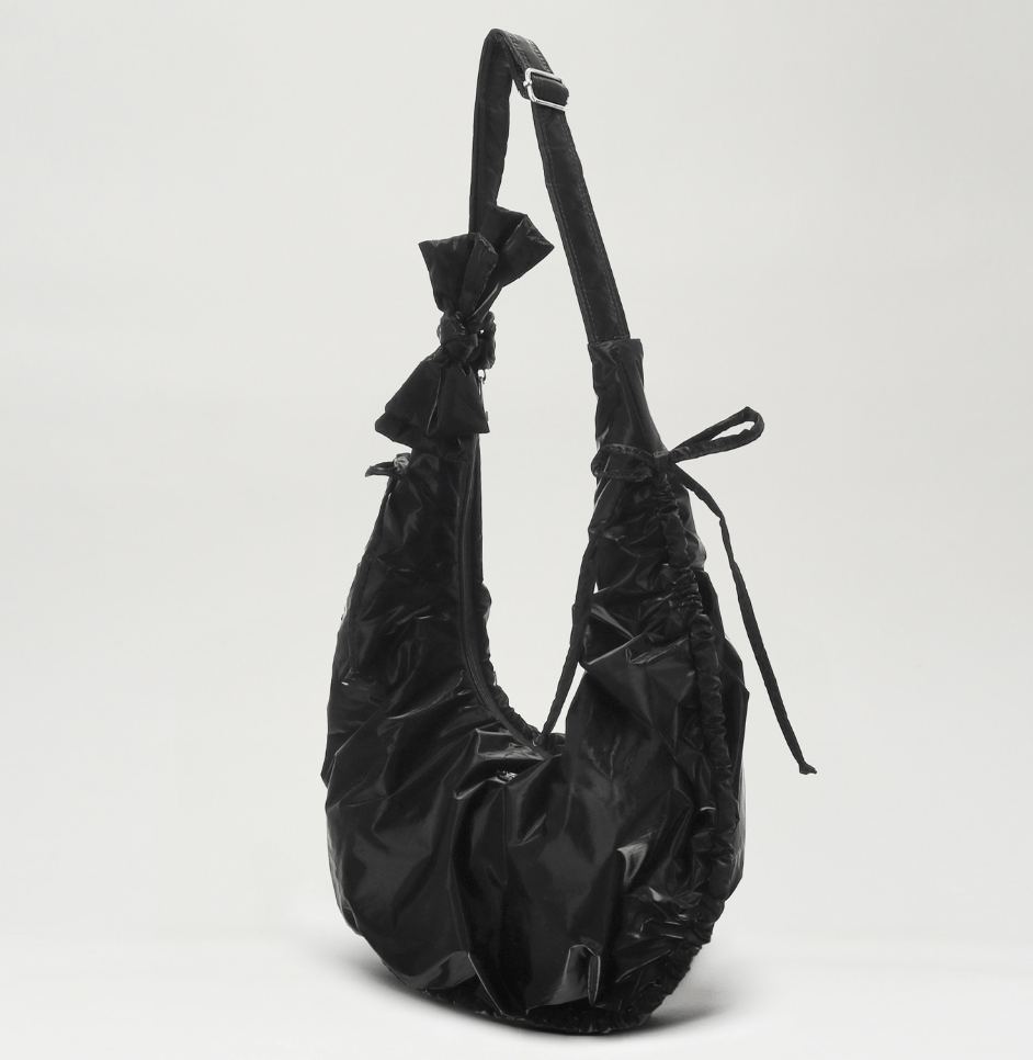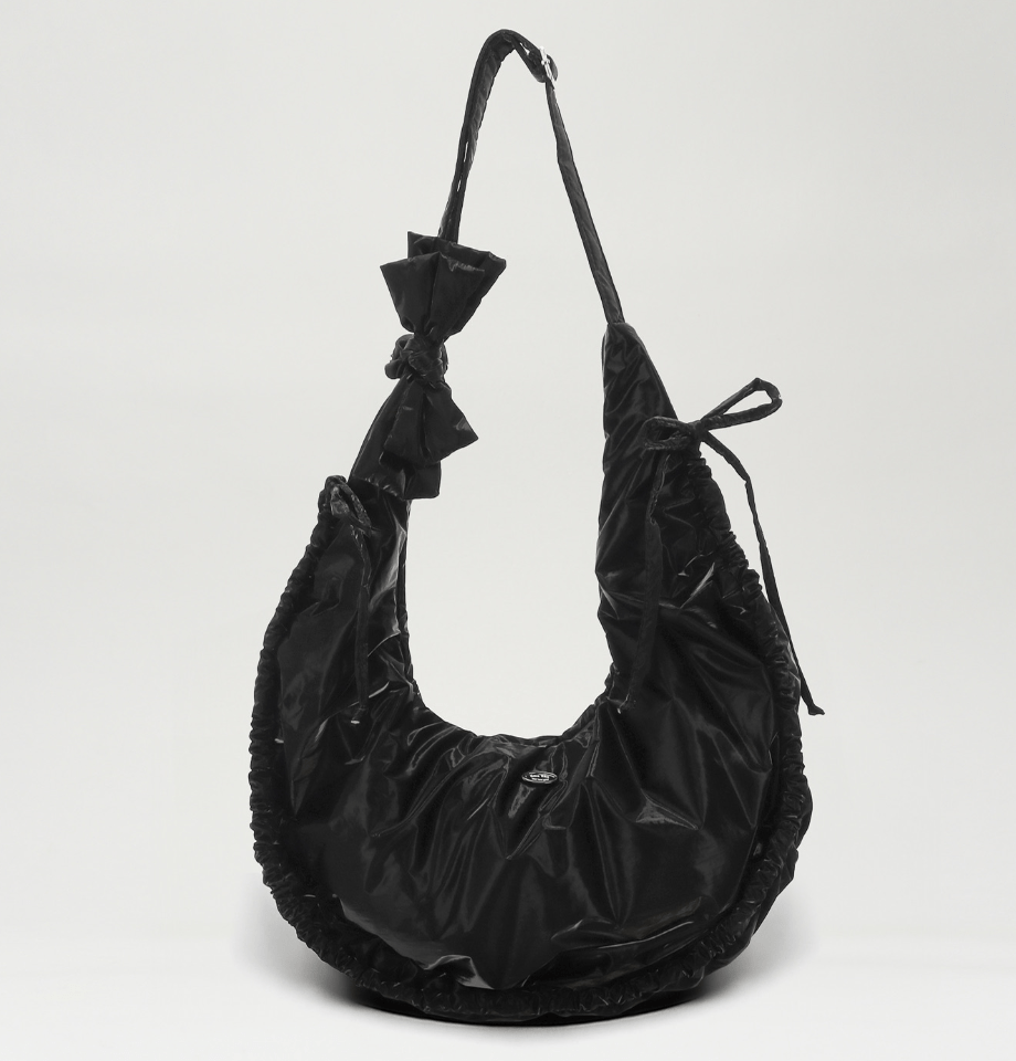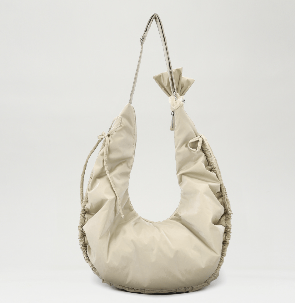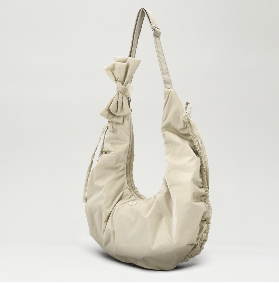 包包的形狀設計為圓潤的半月形,搭配柔和的包邊和可愛的綁帶,增添了俏皮感。
