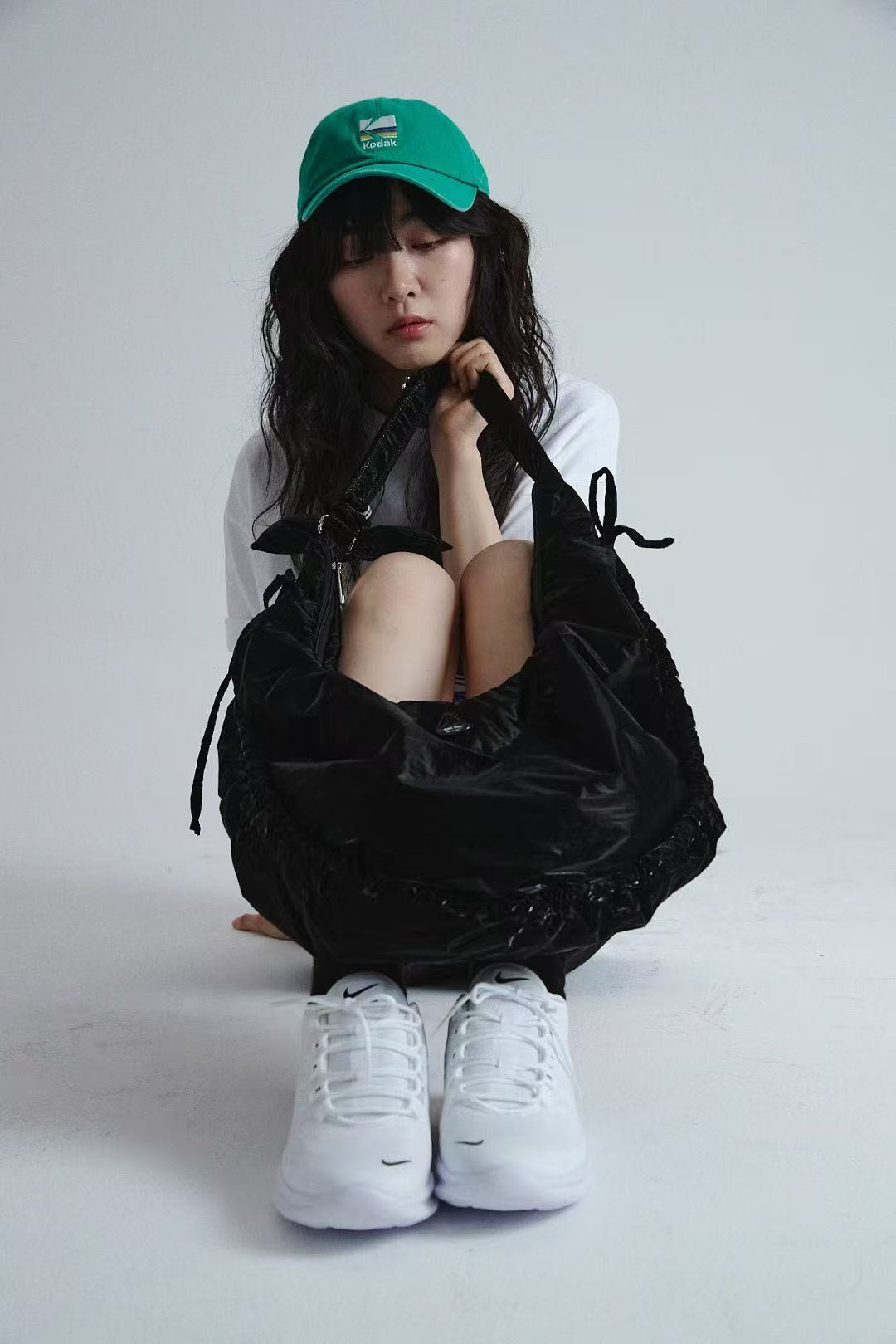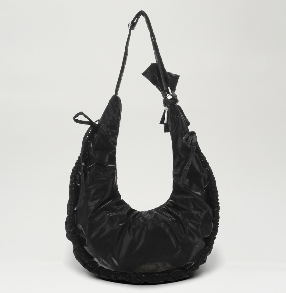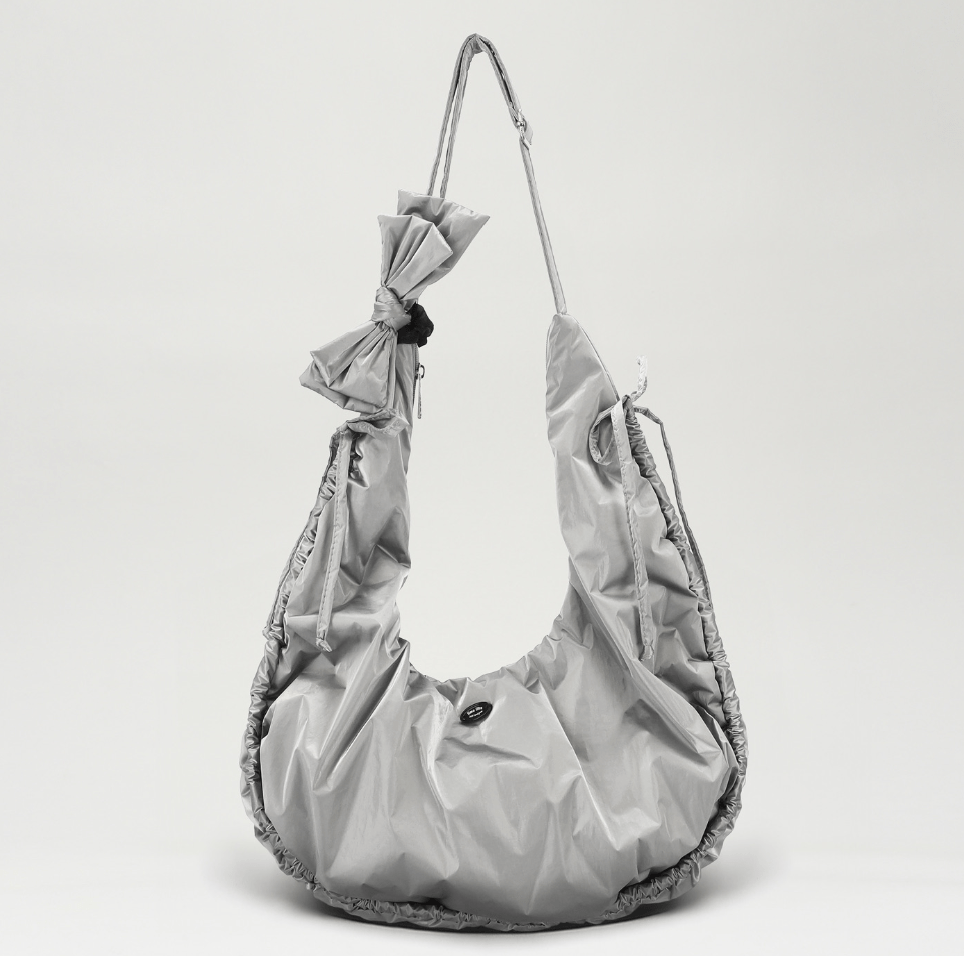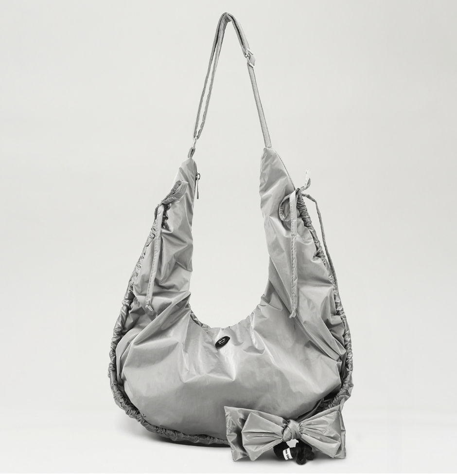 包包的形狀設計為圓潤的半月形,搭配柔和的包邊和可愛的綁帶,增添了俏皮感。