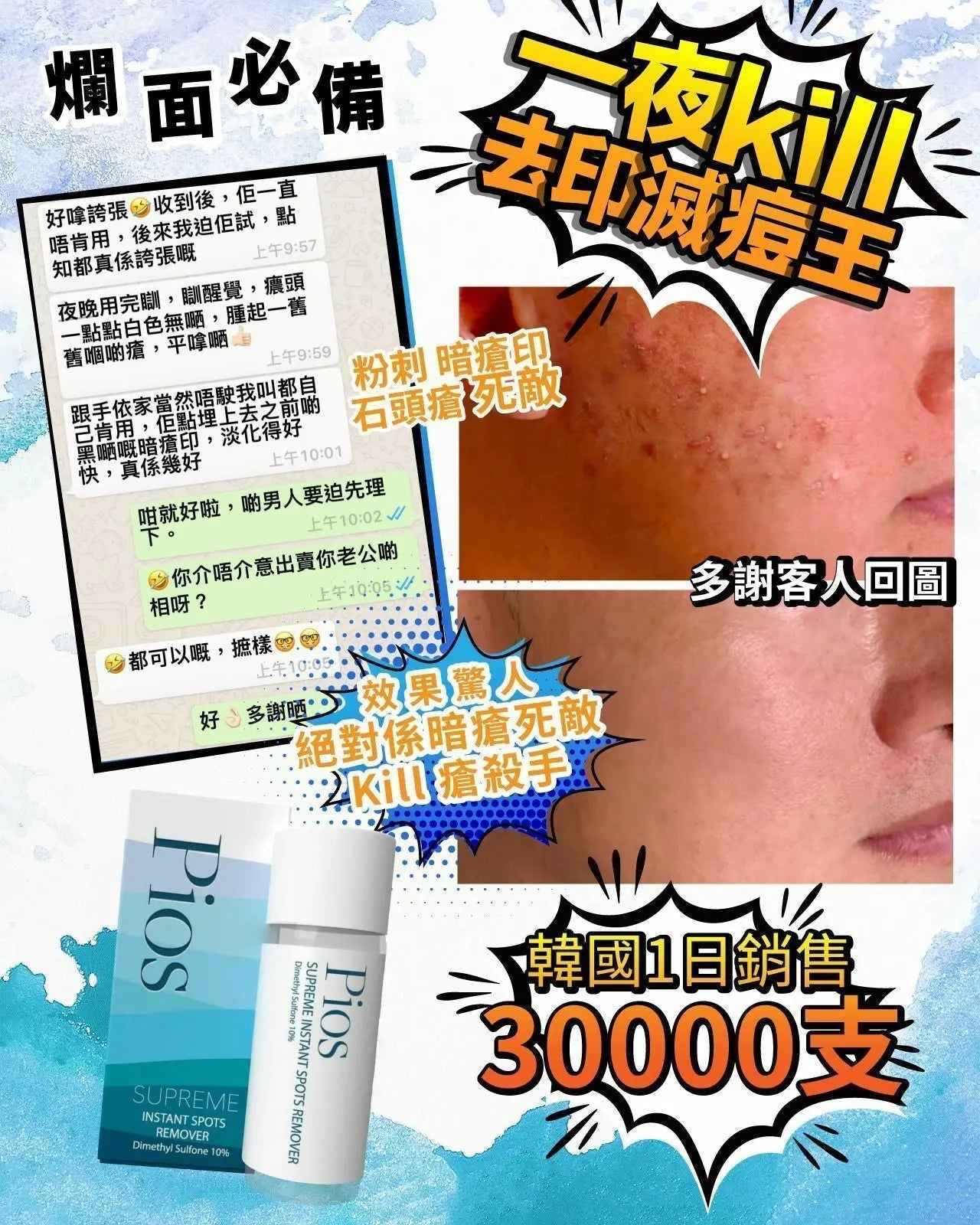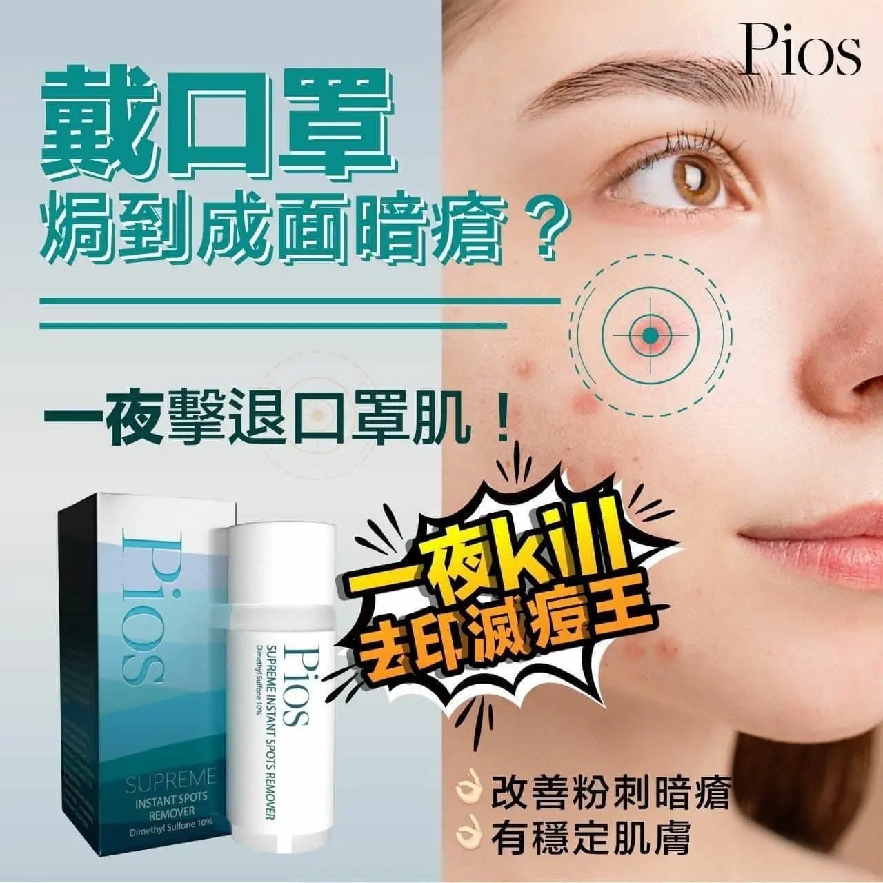 Pios瞬時去痘淨膚精華擁有「去印滅痘王」之稱,主要針對粉刺暗瘡、紅腫痘痘,有效穩定肌膚,同時讓肌膚提供屏障,抑制皮脂過剩,預防粉刺及暗瘡生長,減少毛孔堵塞,使油脂分泌更順暢,快速見效,持續使用更有助收細毛孔。